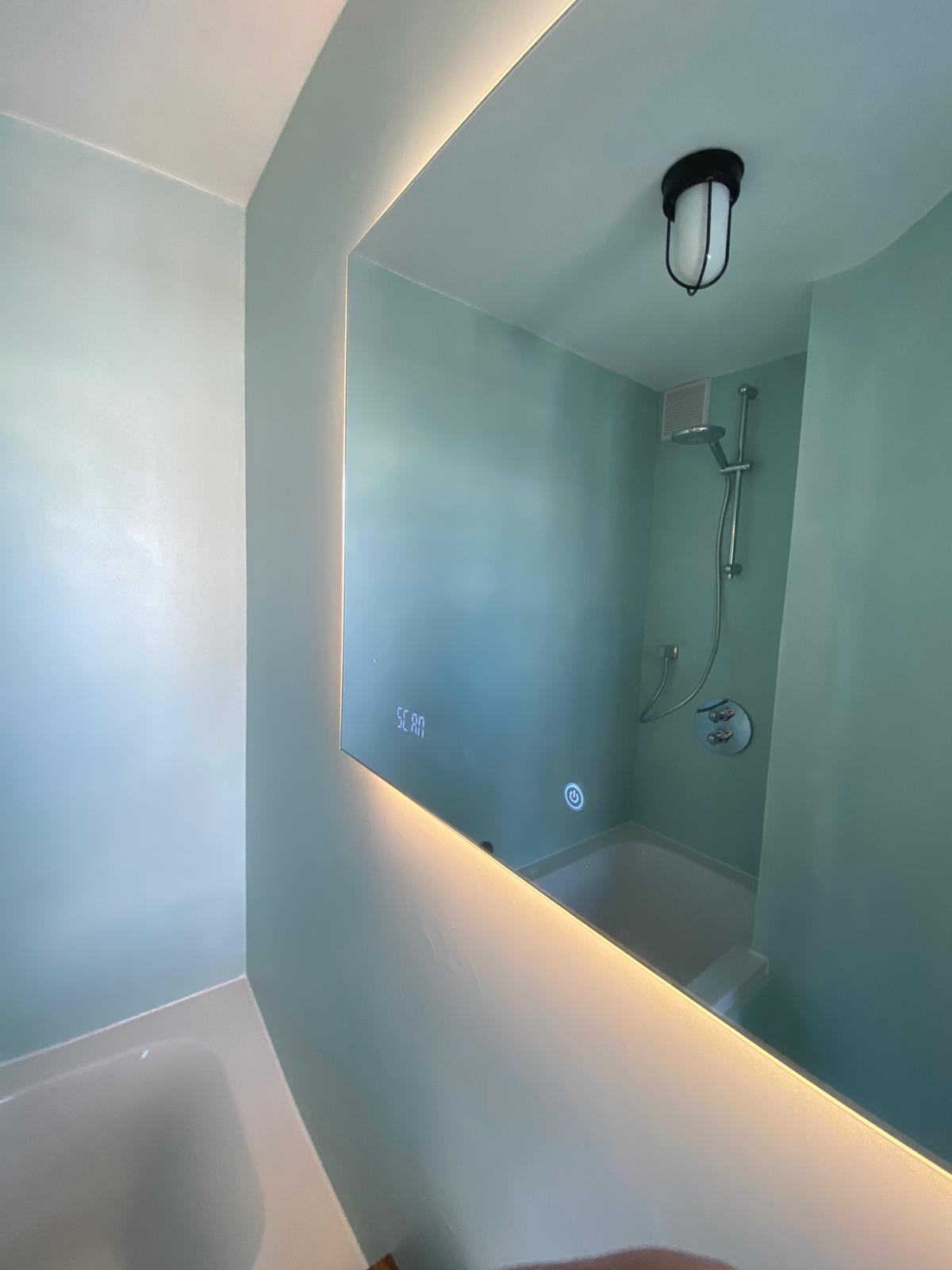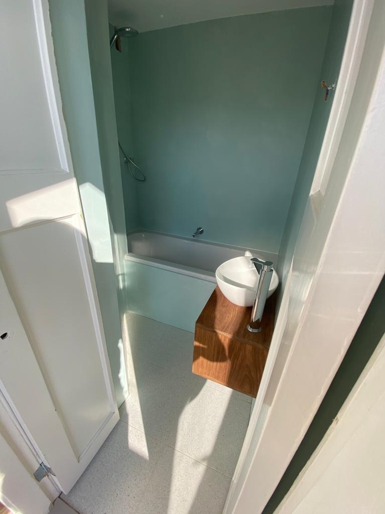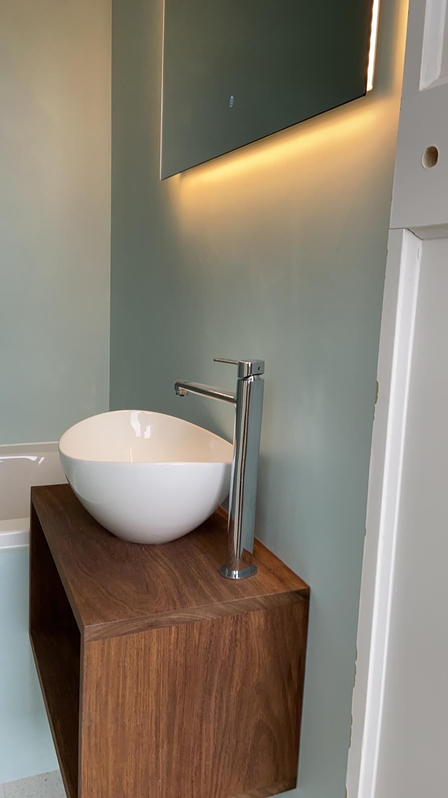 Badkamer renovatie met een zelf gemaakte wastafelmeubel.