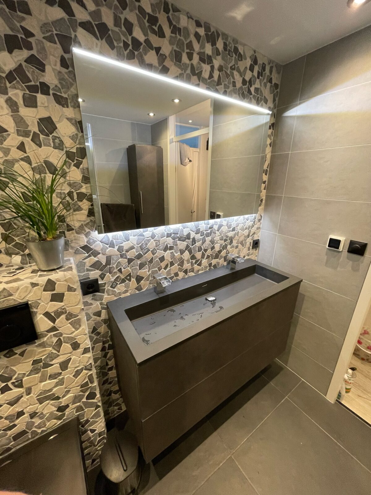 Badkamer renovatie met een zelf gemaakte wastafelmeubel.