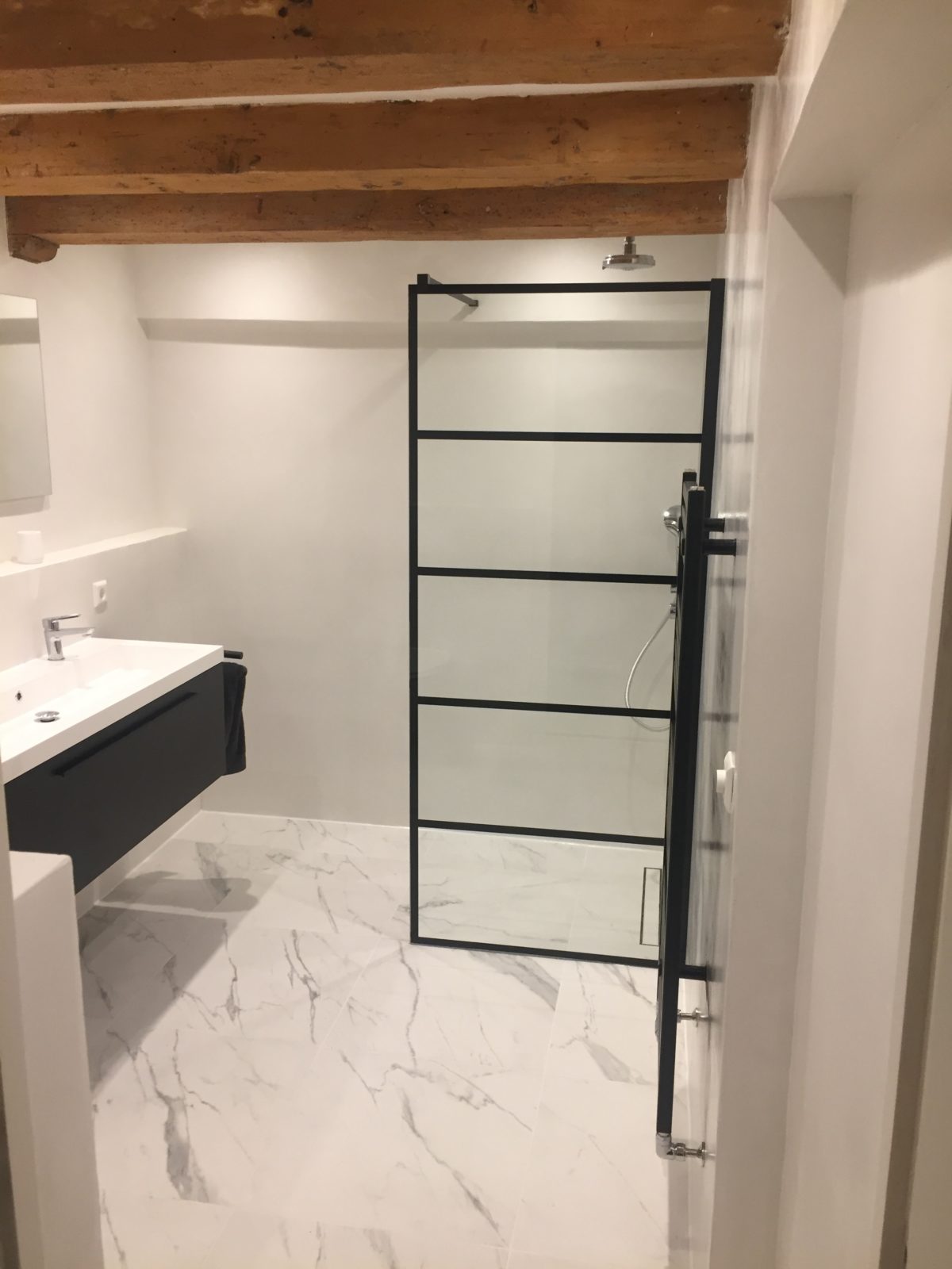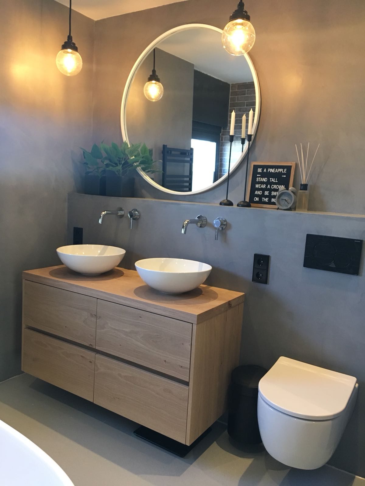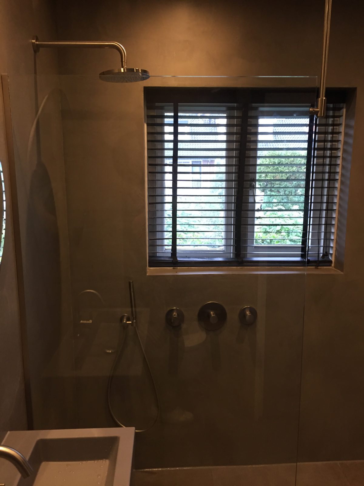 Badkamer renovatie met beton ciré in de kleur Smoke.